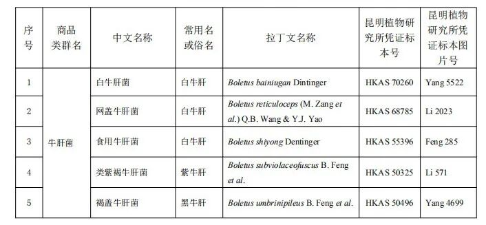 根据《中国大型真菌彩色图谱》记载,牛肝菌科下有14个不同的牛肝菌属,其中牛肝菌属(Boletus)又包含了33种不同种的牛肝菌,例如双色牛肝菌、黄柄牛肝菌、火红牛肝菌、美味牛肝菌、黄褐牛肝菌、黑紫牛肝菌、金黄牛肝菌等等。